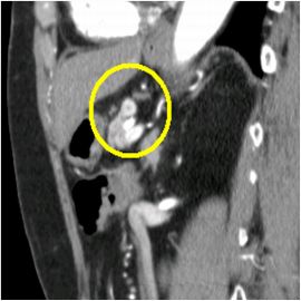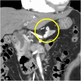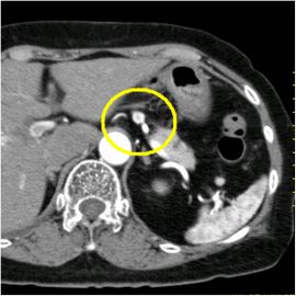CT検査にて膵体部に腫瘍を認め、精査の結果、膵体部腫瘍疑いと診断し膵体尾部切除術を施行した。