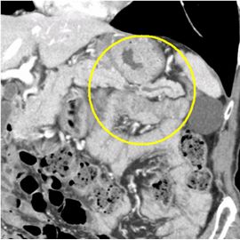 CT検査にて膵体部より末梢の主膵管拡張を認め、精査の結果、膵体部腫瘍疑いと診断した。腹腔鏡補助下にて膵体尾部切除術を施行した。病理診断結果は上皮内膵がん(Pan-In 膵がん)であった。