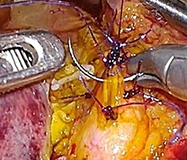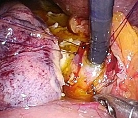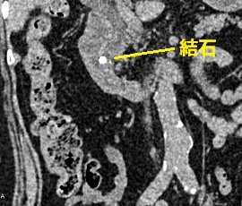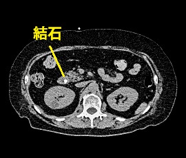 急性腹症にて救急受診。精査の結果、総胆管結石と診断。腹腔鏡下胆管切開結石除去術(胆嚢摘出術含む)を施行した。