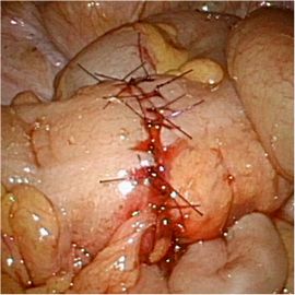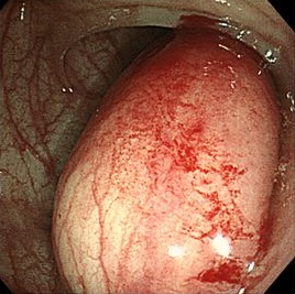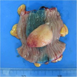 下部消化管内視鏡検査にてS状結腸に病変を認め、単孔式腹腔鏡下結腸切除術を施行した。病理診断結果は粘膜下腫瘍であった。