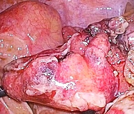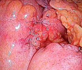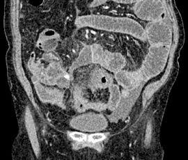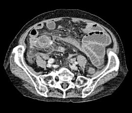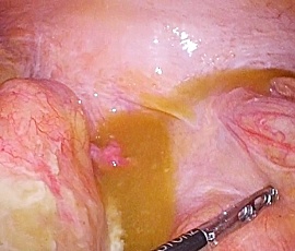 右下腹部痛にて受診。精査の結果、急性虫垂炎、汎発性腹膜炎と診断。手術(腹腔鏡下回盲部切除術、腹腔内ドレナージ術)を施行した。