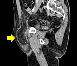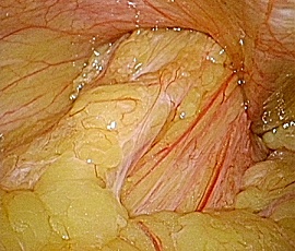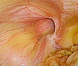 検診にて左下腹部の腫脹を指摘され受診。精査の結果、鼡径ヘルニア嵌頓(かんとん)と診断。手術(腹腔鏡下ヘルニア手術(TAPP法))を施行した。