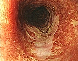 食道がんの精査は主に上部消化管内視鏡検査で行います。食道の内視鏡検査では、粘膜の色や凹凸などを直接観察します。また、がんを疑う病変に対しては、内視鏡で観察しながら鉗子(かんし)と呼ばれる器具で病変の一部を採取(生検)して、顕微鏡による病理診断を行い、がんの有無を調べます。その際にはがんの拡がりや深さを診断しやすくするために、特殊な色素(ヨード色素)を粘膜に散布したり、特殊な波長の光(NBI)を使用し、精度の向上に努めています。