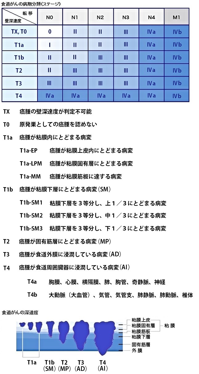 食道がんは壁深達度(T)により、粘膜内にとどまるものを早期食道がん、粘膜下層までにとどまるものを表在がん、それより深い層に及んでいるがんを進行食道がんに分類されます。 食道がんは比較的早い段階でリンパ節や肝臓・肺などへ転移(てんい)したり、また、大きくなると外膜を越えて隣接する大動脈、気管・気管支などの重要臓器に浸潤(しんじゅん)する場合があります。