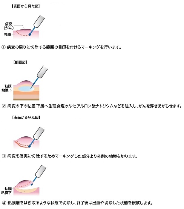 当院においても可能なかぎり早期がんに対しては 内視鏡的粘膜下層剥離術(Endoscopic submucosal dissection、ESD)[下図]を行っております。治療手技は内視鏡治療用の電気のメスで直接、病変部を切って剥ぎ取る方法です。 切除された食道がんを含む組織は、顕微鏡で詳細に調べます。治療後にがんが残っている可能性や、リンパ節転移の可能性が高いと判断された場合は、手術や化学放射線療法などを追加して行うことがあります。