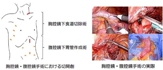 内視鏡治療では切除しきれない、つまりリンパ節をとる必要があると判断される早期食道がんに対しては胸腔鏡・腹腔鏡手術を行っております。当院では食道がんに対して、頸部・胸部・腹部の3領域に及ぶリンパ節郭清を行い、食道を切除する方法を標準手術としています。従来、食道がんに対する手術は開胸(胸を大きく開ける)、開腹(腹を大きく開ける)手術が行われてきました。現在当院では、胸腔鏡下食道切除術を行っており、3D内視鏡システムを用いた微細な画像により確実なリンパ節郭清を含む食道切除を行っております。また切除した食道を取り出すことおよび胃管作成ための切開創(傷)は上腹部に約5cmで十分であり、腹腔鏡補助下での手術を主に行っております(腹腔鏡下胃管作成術)。