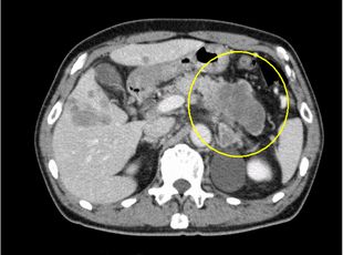造影CT横断像(膵尾部がん)