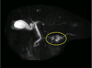 CT検査と同じような画像が得られますが、MRCP(MR 胆管膵管撮影)という特殊な条件での撮影では胆管や膵管の描出に優れており、膵臓がんによる胆管や膵管への圧迫の有無がわかります。