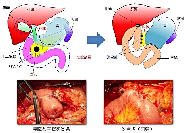 がんが血管に浸潤している場合には、血管を合併切除します。切除後には、膵臓と空腸、胆管と空腸、胃(十二指腸)と