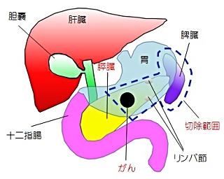 膵体尾部と脾臓、膵周囲のリンパ節を摘出する手術です。門脈、腹腔動脈、副腎などにがんの浸潤を認める場合には、