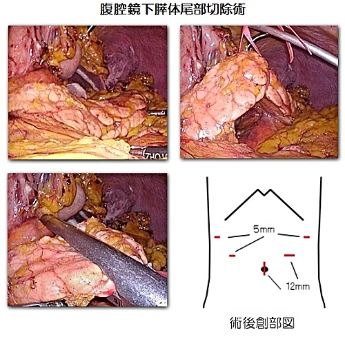 また症例によっては、腹腔鏡下膵体尾部切除術を行う場合もあります。術後の傷は小さく美容面で優れており、術後の