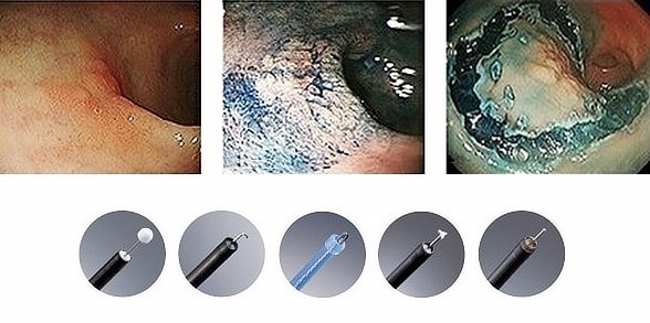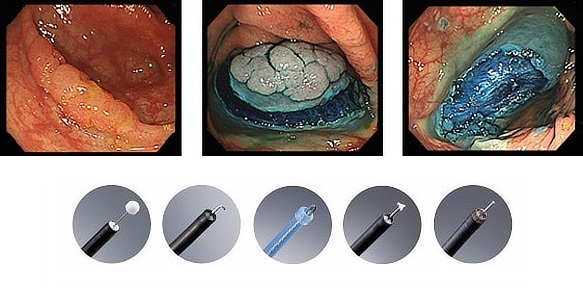 治療手技は内視鏡治療用の電気のメスで直接、病変部を切って剥ぎ取る方法です。高度