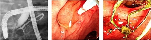 (EST))。出口を広げた後、結石除去用のバスケット鉗子を胆管内に挿入して結石を除去