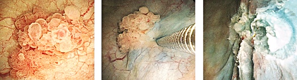 病巣部を確認します。電気メスの鉗子を挿入し病巣部を一括切除します。術後病理診断