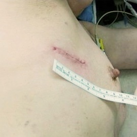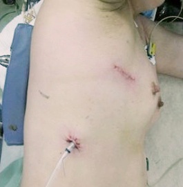 開胸手術(左)と胸腔鏡手術(右)の創部写真