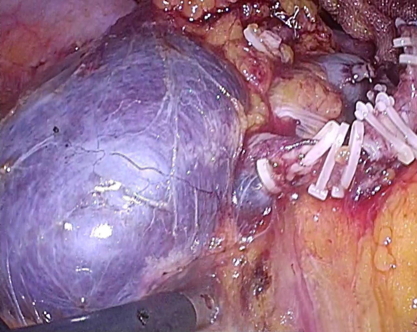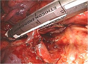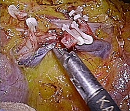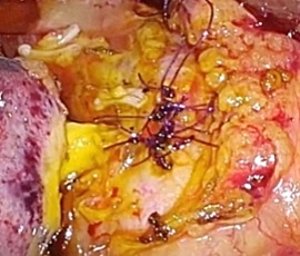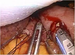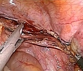 用いて子宮動脈の結紮切離、全周性に膣管の切開を腹腔鏡操作で行います。切除された