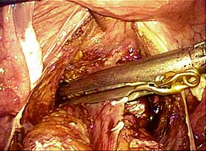 では、膣管の切開開放までの全ての操作を腹腔鏡で行う全腹腔鏡下子宮全摘術 total