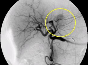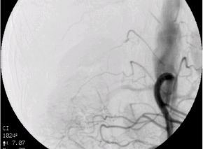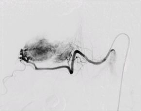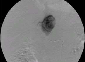 )を栄養血管へ選択的に挿入し、腫瘍の近傍まで進め、そこから造影を行います。